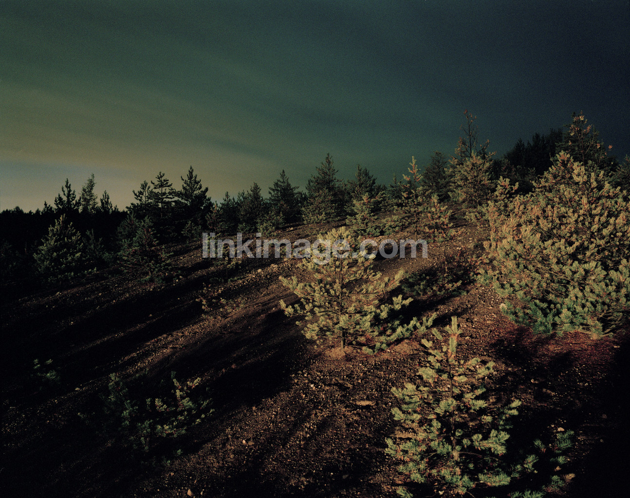 - night, spruce, lit, light, sky, tree, tree planting