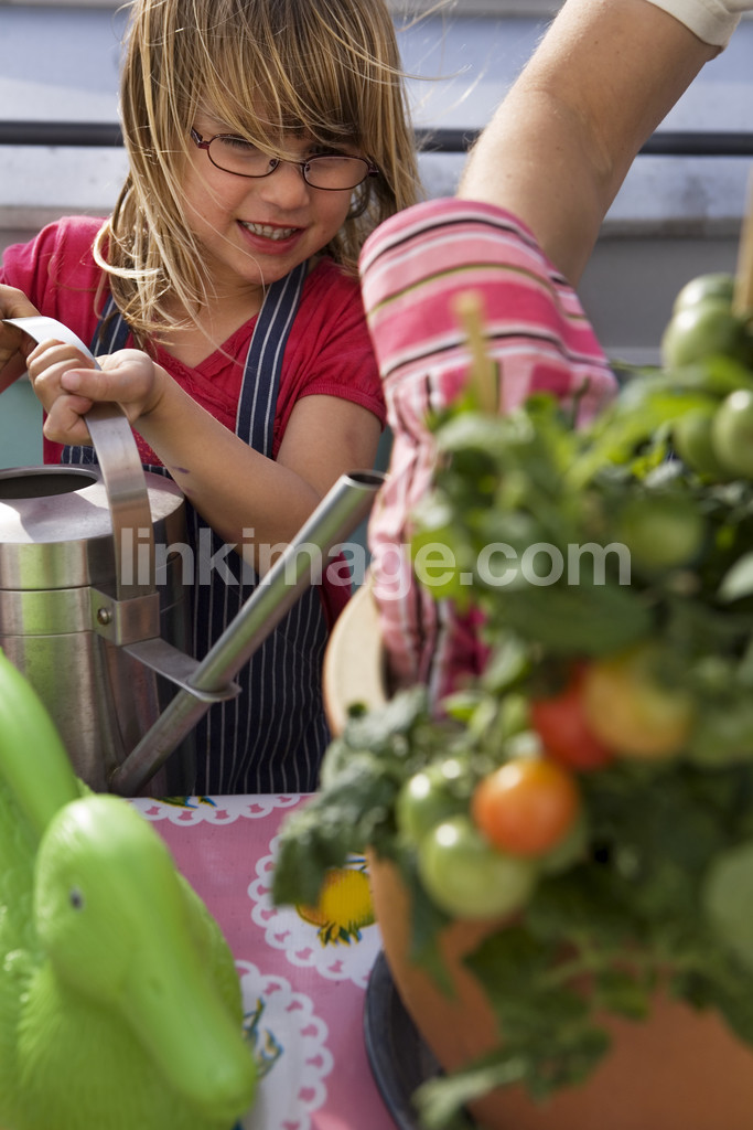 irrigate, children, plant, plants, spring, balcony, city, girl, eyeglasses, nature, hobby