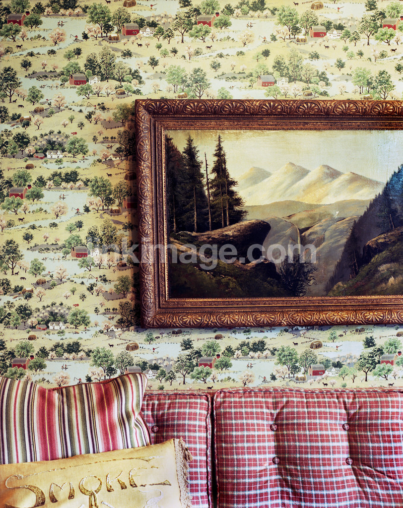 - Painting in gold frame against gaudy wallpaper