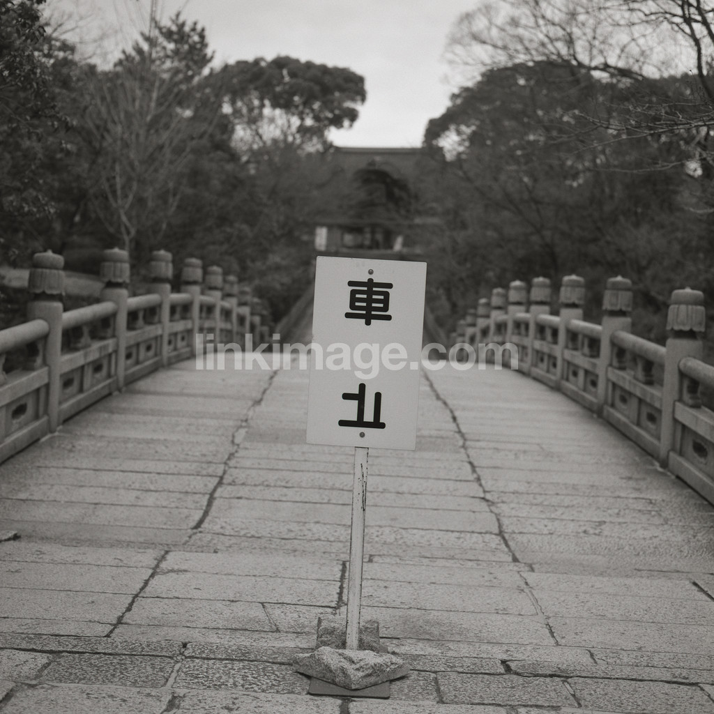 - bridge, sign, characters, japanese, text, house, country, tree, information, time