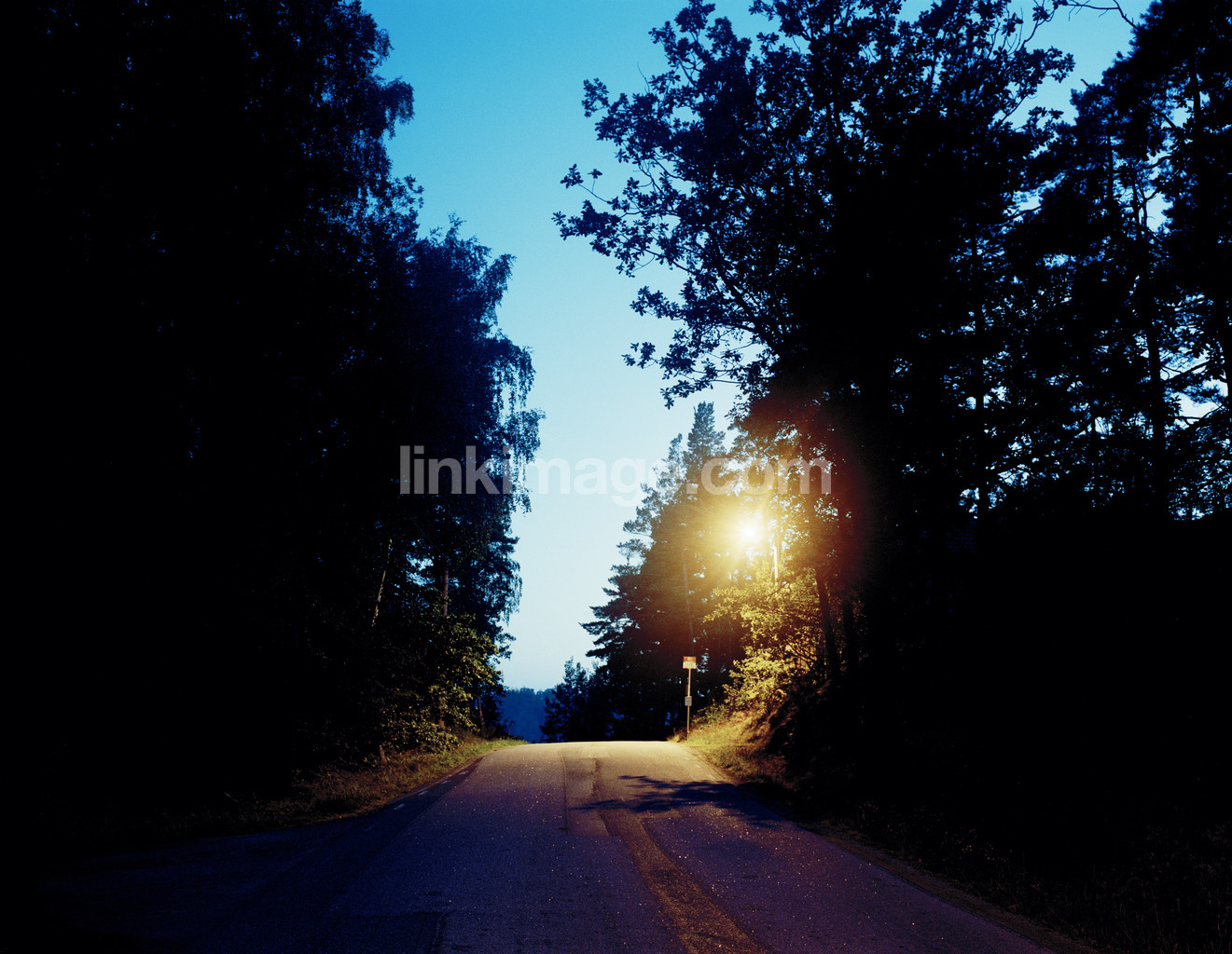 - night, evening, bus stop, stop, wait, summer, light, streetlight, alone, fate, rural, road, public transport.