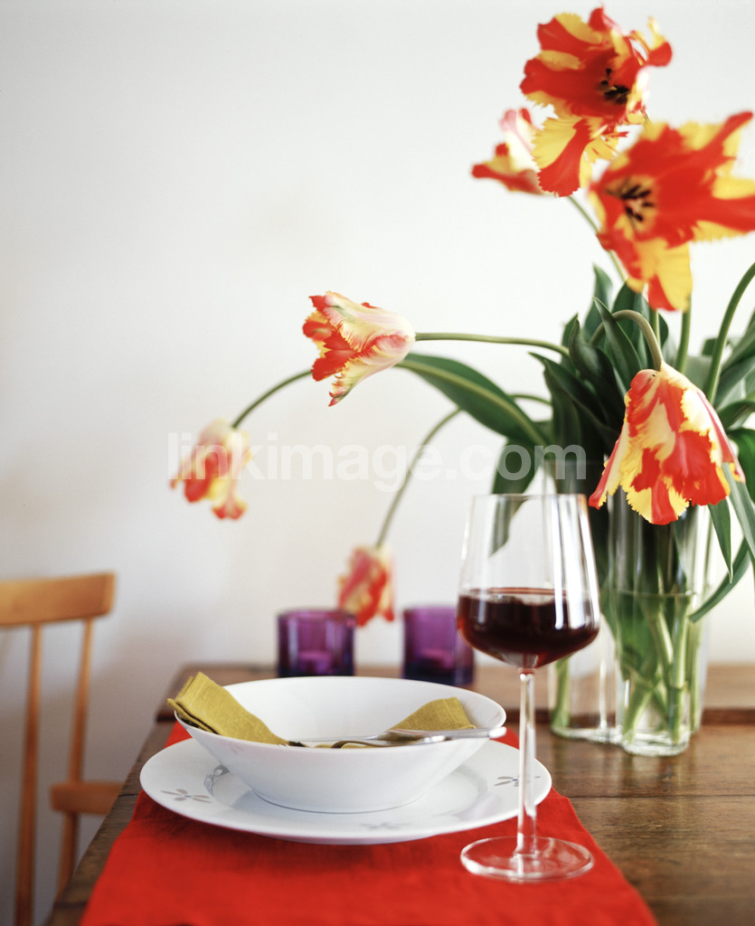 - table setting, food, wine, dinner, flowers, tulips, party, chair, table, light