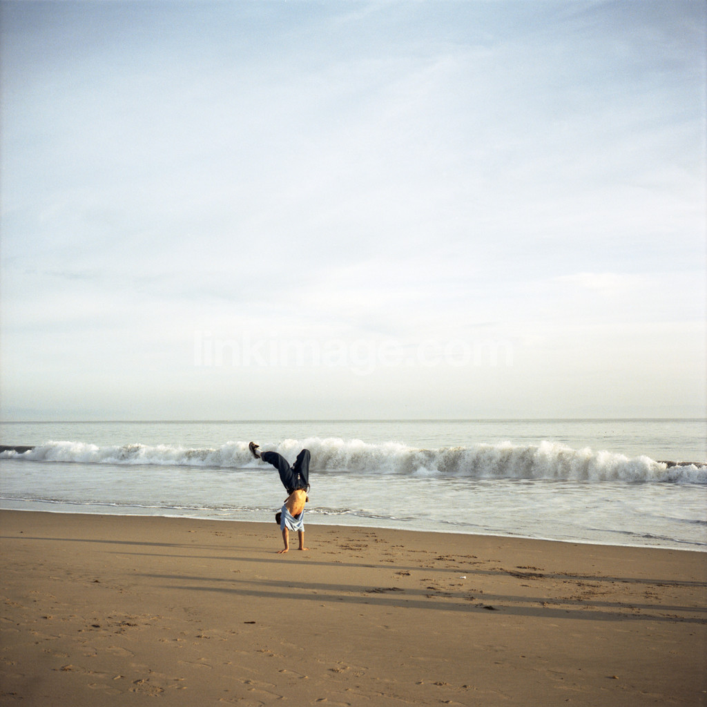 shore, sea, wave, freedom, summer, acrobat, play, youth, strength, joy, ca, sand, sandy beach, male, guy, boy, horizon