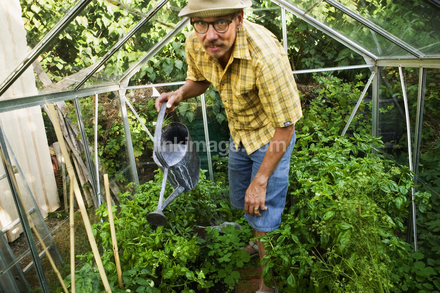 - summer, water, heat, growing, greenhouse, garden, male, out, vegetables, jug, greens, checkered, shirt, hat, eyeglasses
