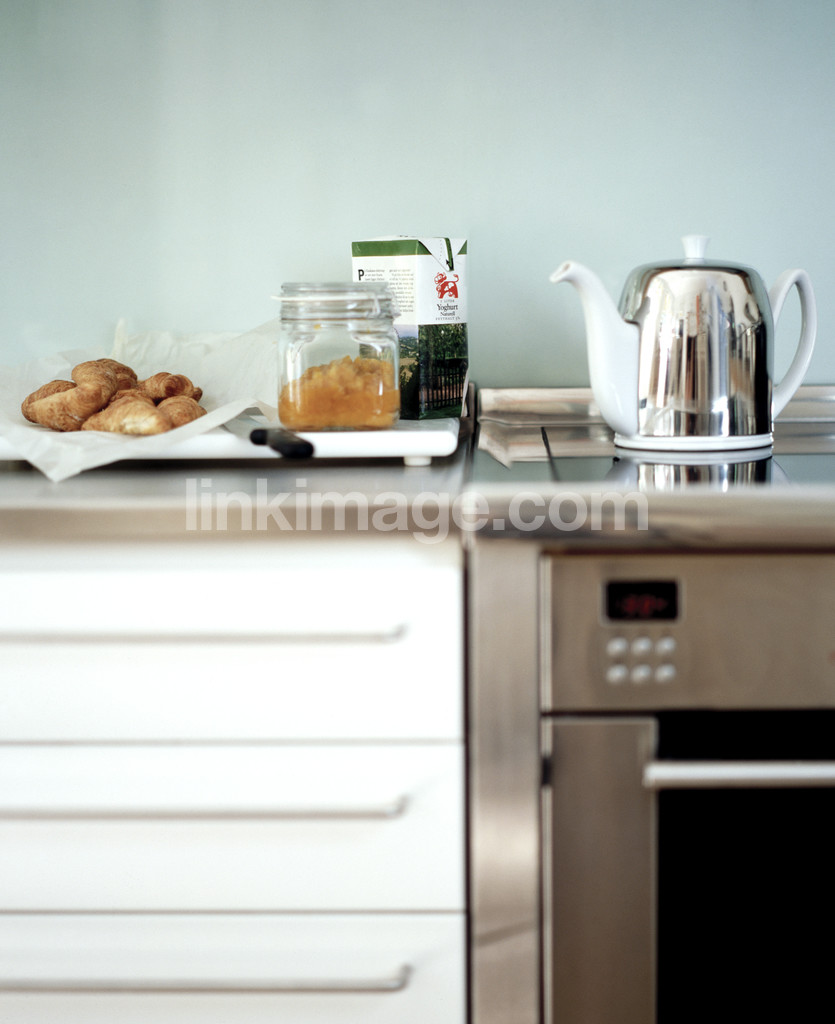 - kitchen, breakfast, teapot, file, bread, jam, bench, oven