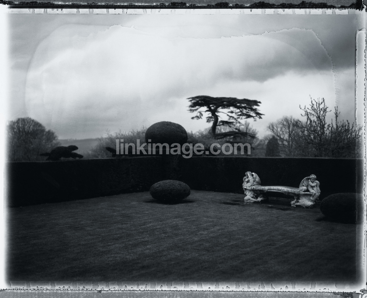 garden, bleak, dark, park, grass, lawn, tree, castle park, bench, fall, evening, dusk