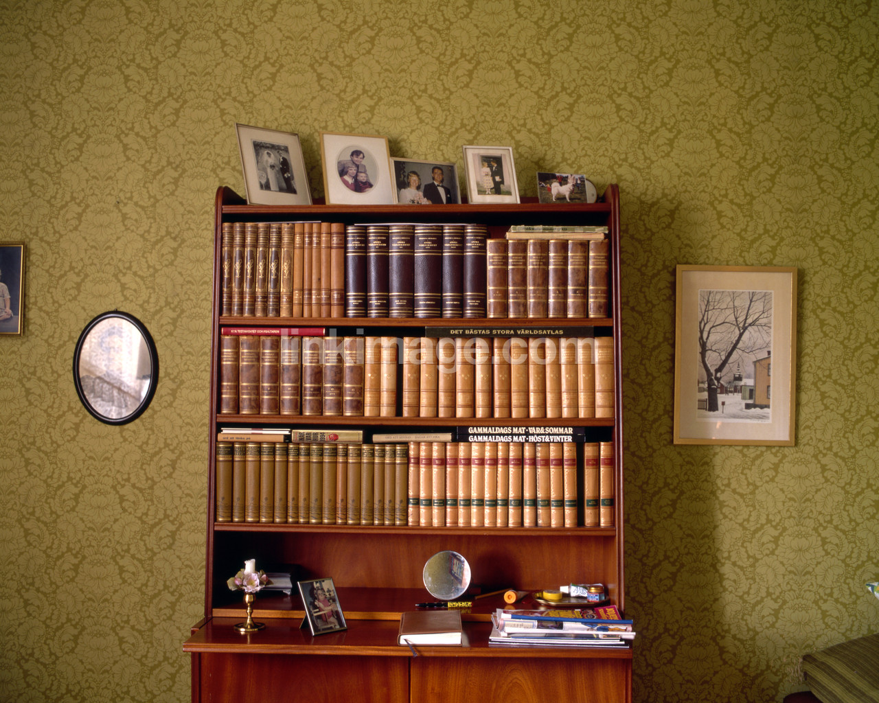 books, cabinet, shelf, storage, plate, wallpaper, room, home, interior, older, lodging, book, pattern, retro
