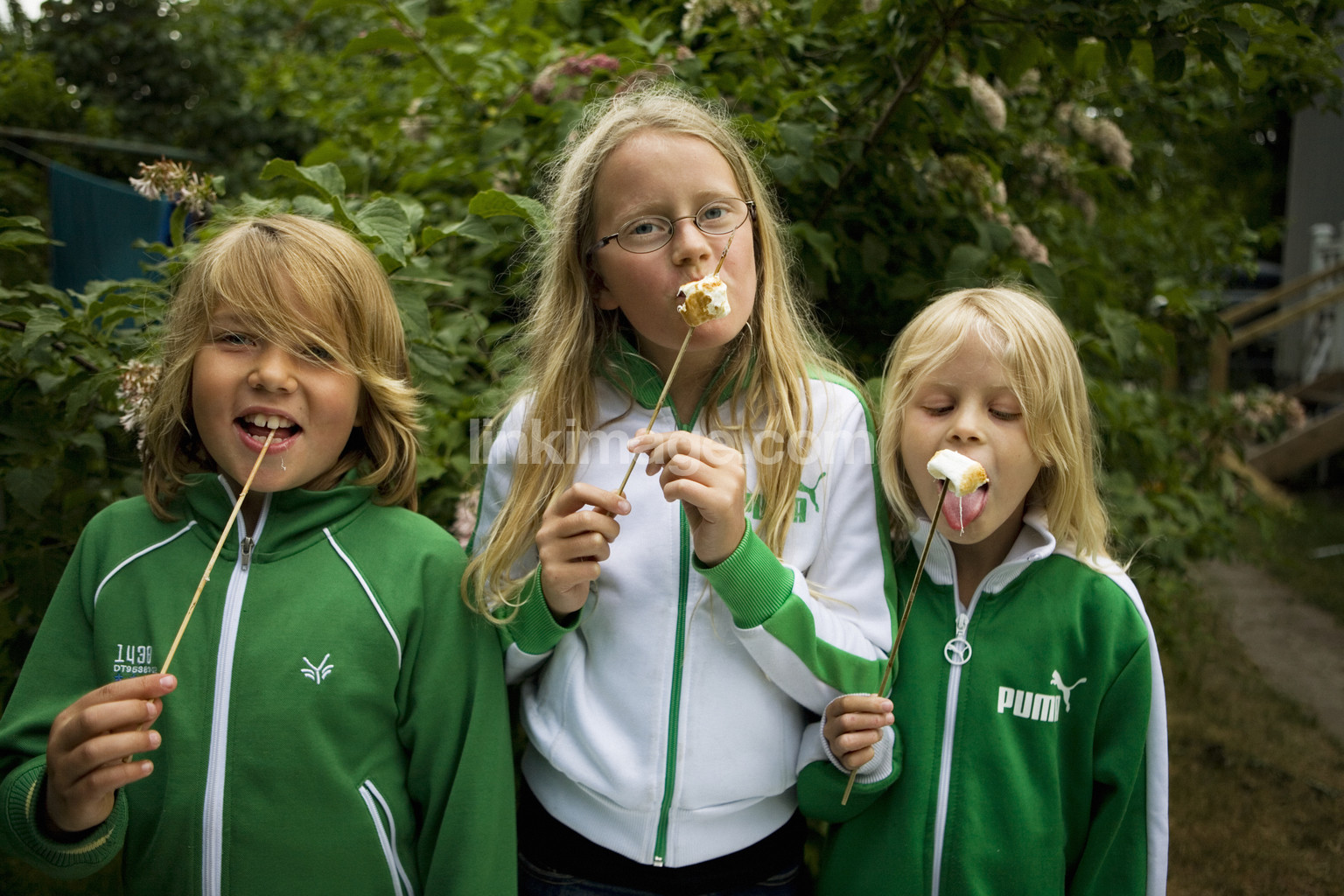 children, together, party, bus, food, dessert, grilling, marshmallows, girls, guy, siblings, candy
