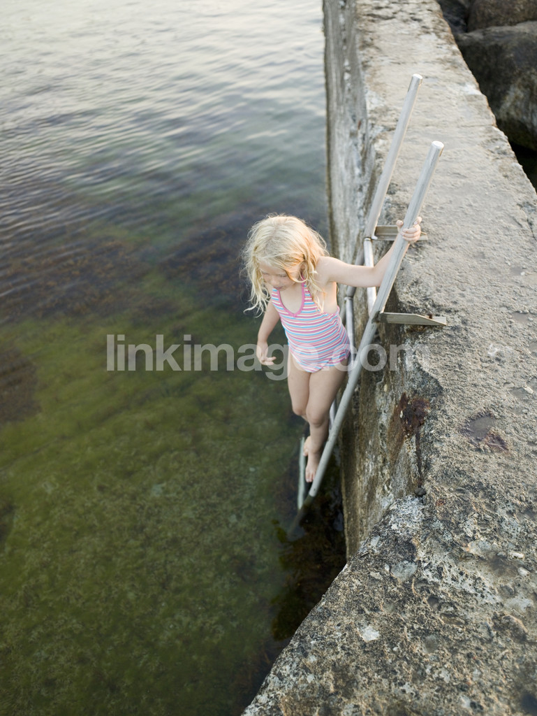 - poor, evening swim, fishing port, ladder, sunset, girl