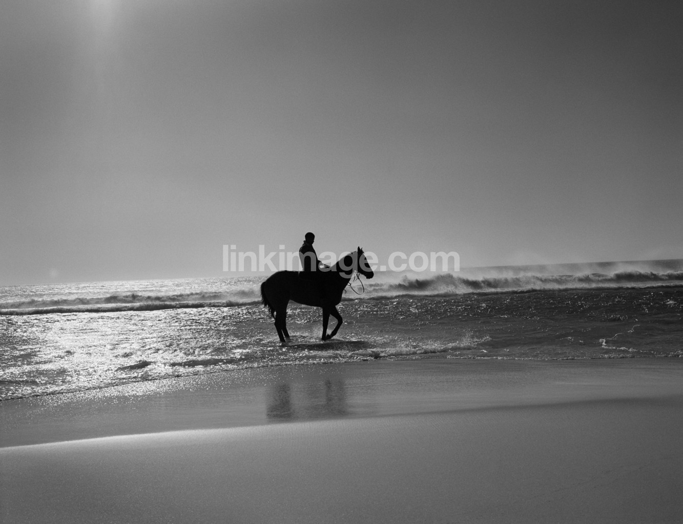 - horse, water, waves, sky, summer, sandy beach, silhouette, shore, ride, leisure, activity, horizon