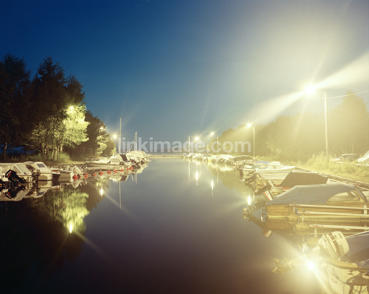 - port, marine, bridge, small boat, motorboat, evening, night, becalmed, blank, surface, lake, sea, archipelago, lit, lights, leisure, awake, guard