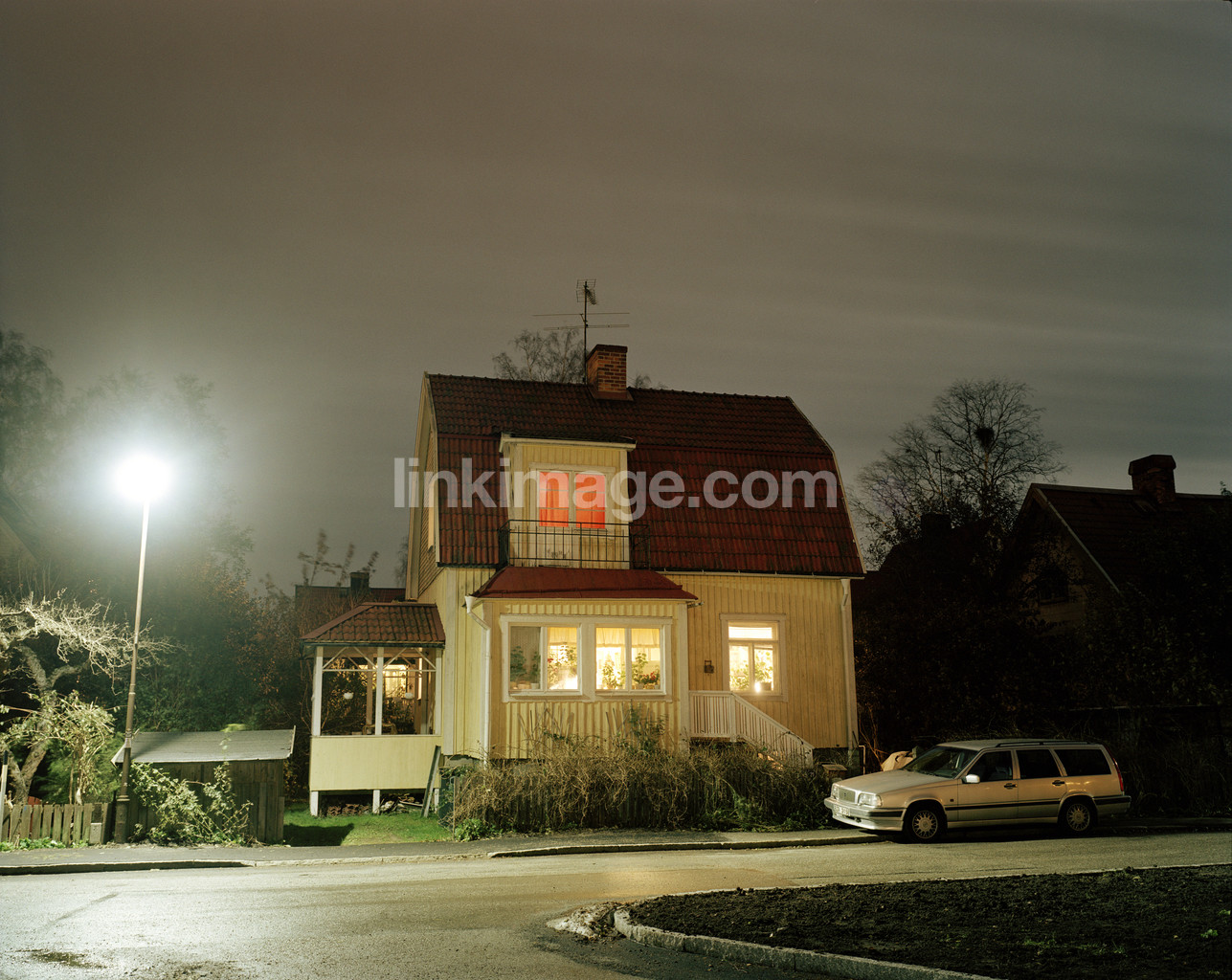 - house, villa, suburb, small town, wooden house, evening, night, volvo, yellow, lit, home, visit, parking, street, garden, lighting, lamppost