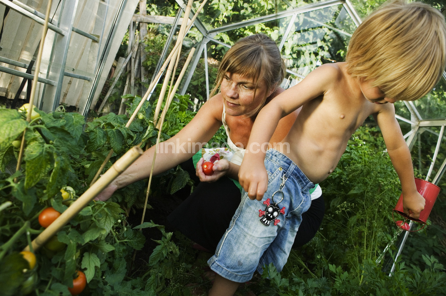 - children, mother, greenhouse, help, irrigate, growing, vegetables, summer, garden, hot, water, watering can