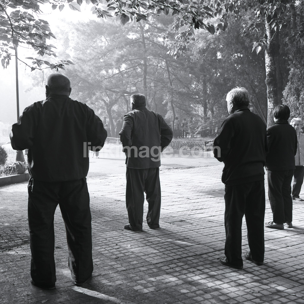 - falun gong, gymnastics, morning, dawn, male, women, female, group, park, meditate, health, people