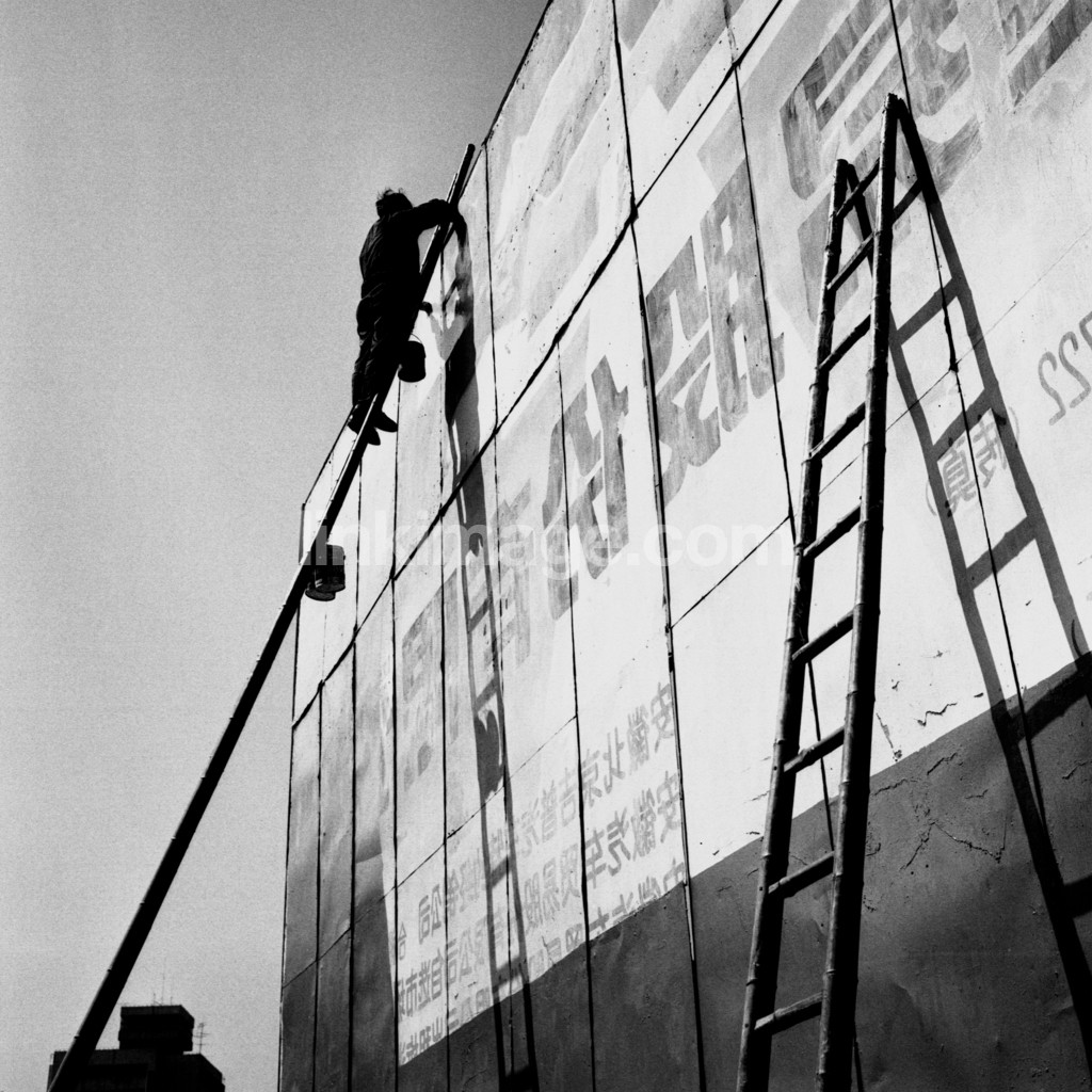 paint, poster, items, text, letters, graphic, ladder, advertising, sign, job, work