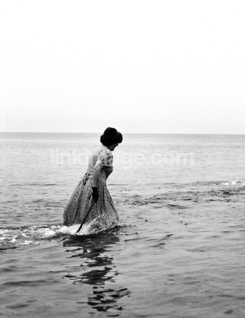- old, female, aunt, bathing, bath, go, cane, sea
