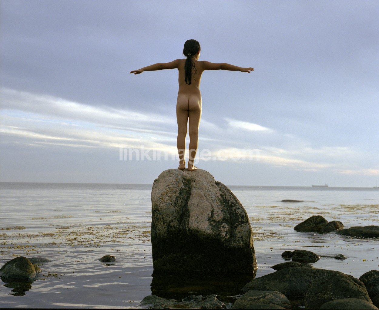 - girl, children, balance, stone, shore, free, freedom, horizon, nude, cross, sky