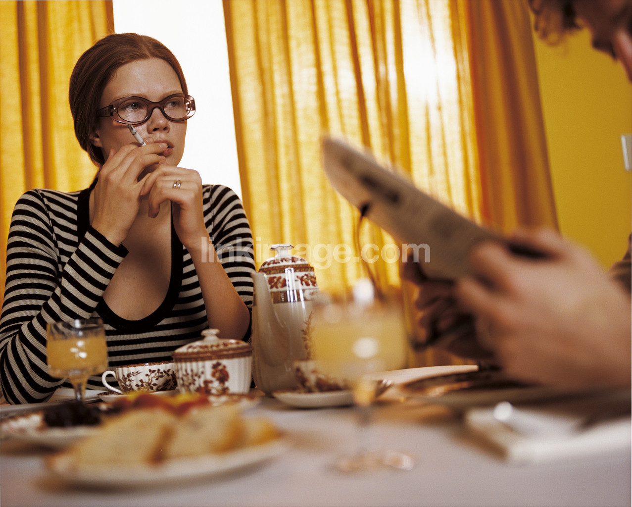 - female, male, breakfast, else, food, tea, coffee, cigarette, smoke, table, journal, read, ignore, nervous, eyeglasses