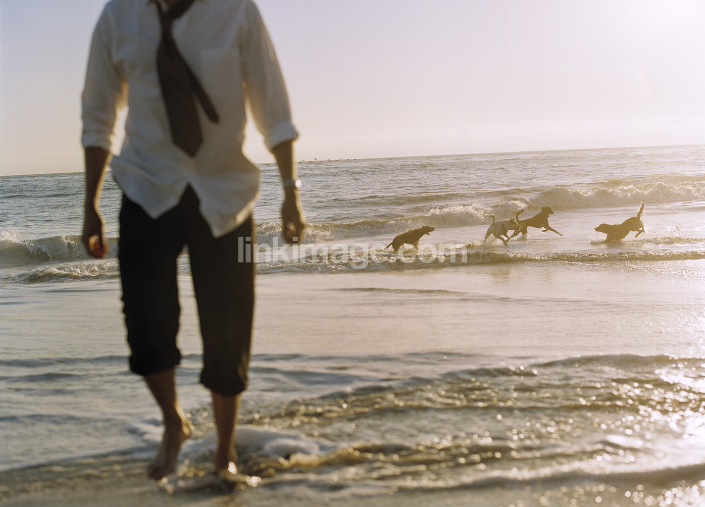 - shore, water, waves, male, dogs, plays, wave, dusk, costume, sea, summer, sandy beach, leisure