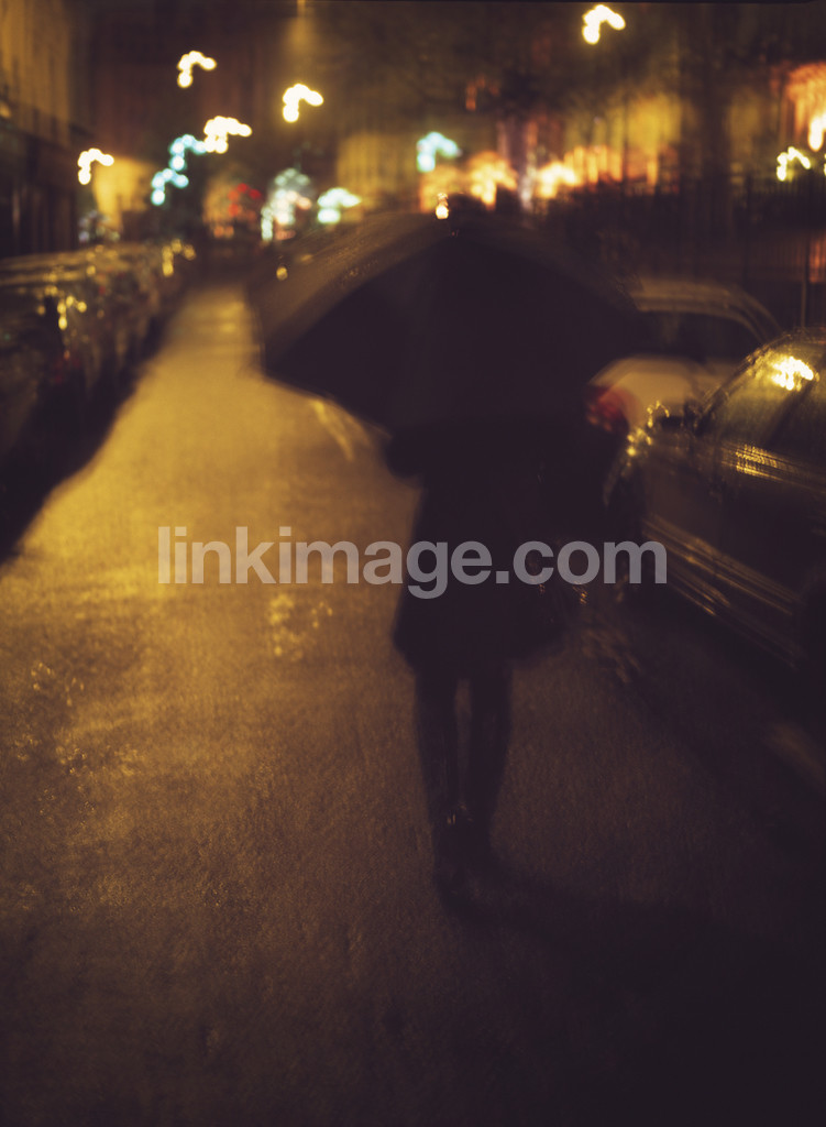 female, go, walk, rain, umbrella, street, night, pavement, city, alone, fate, lighting