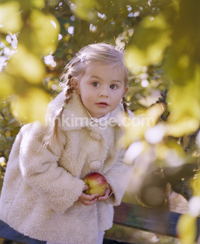 - girl, apple, garden, fall, children, tree, greenery, sweet, cute