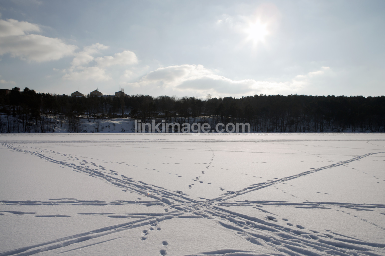 - snow, winter, cool, cold, seasonal, sunshine, lake, frozen, snowy, footprints, shortcut, forest, tree, sl227