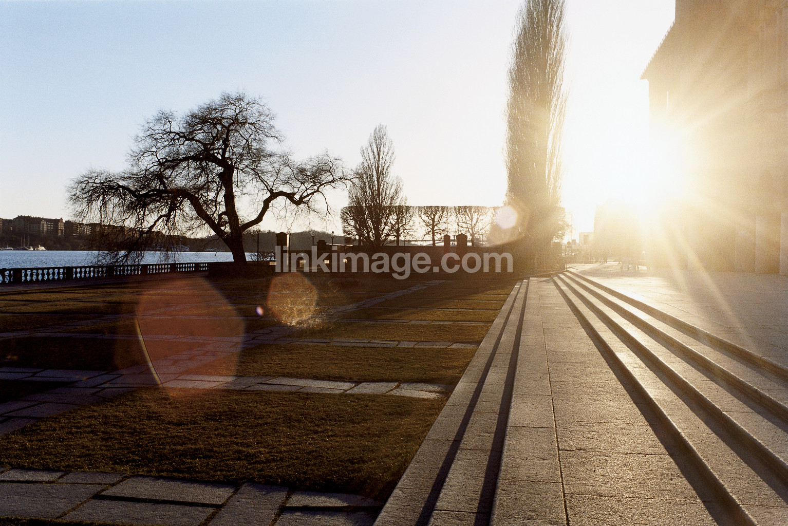 - water, tree, walk, sunshine, sunbeams, backlight, sky, stone staircase, stone slabs, lawn, sl246