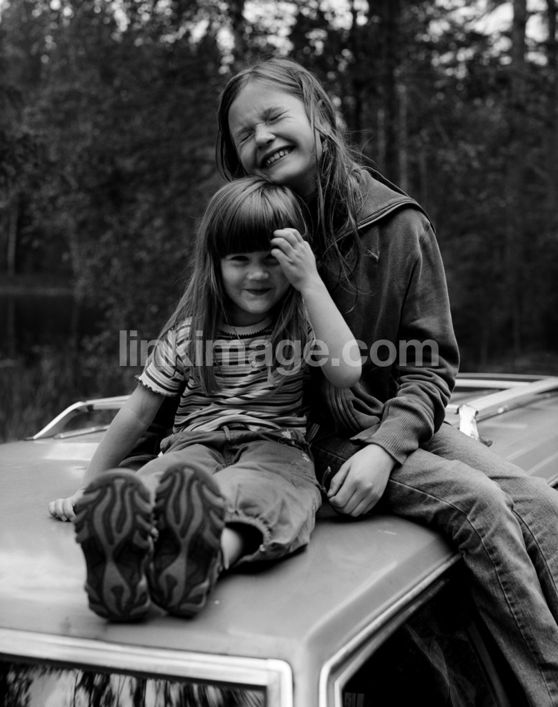 - children, girls, car, car roof, play, happy, grimace, grimace, summer, excursion, leisure, forest, holiday, siblings, sisters