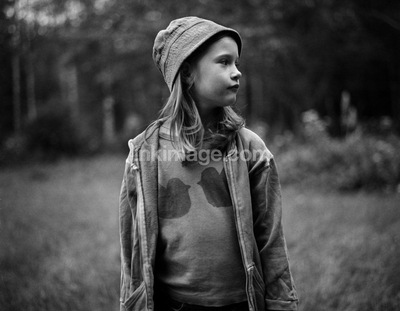 girl, forest, mörkhårig, summer, cap, nature, children, jacket, gaze, watch, profile