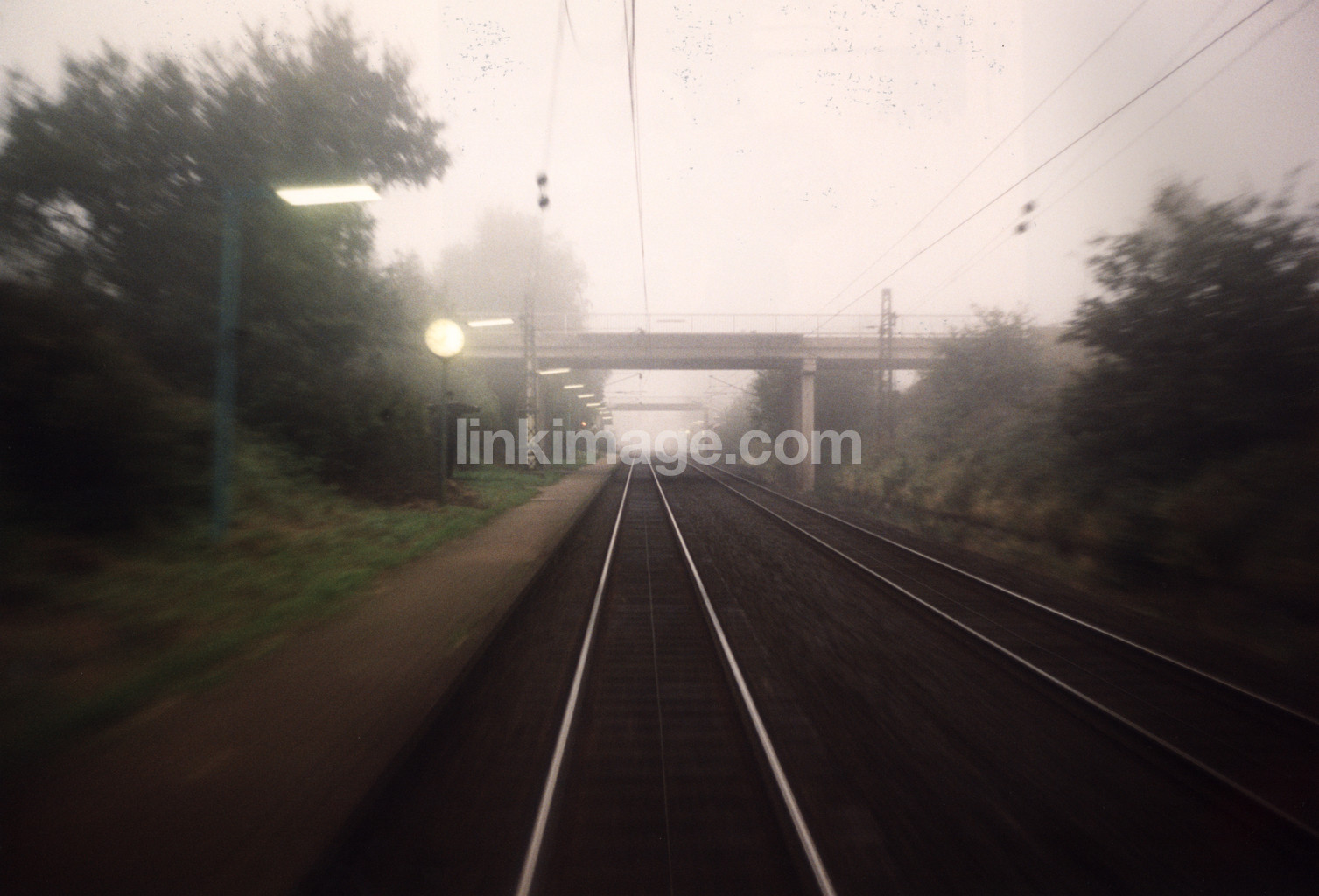rail, track, bridge, fog, nature, aa054, haze, train, trip, movement, speed, stress, environment