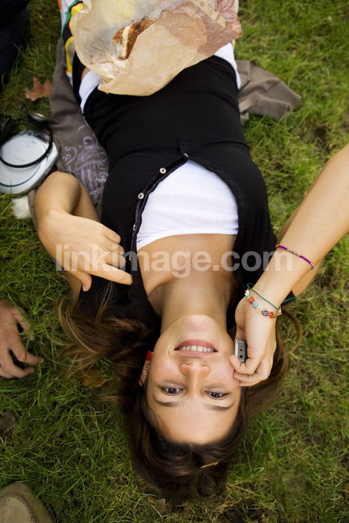 - girl, rest, happy, telephone, mobile, bread, park, lie, break, relaxation, talk, in, grass, female