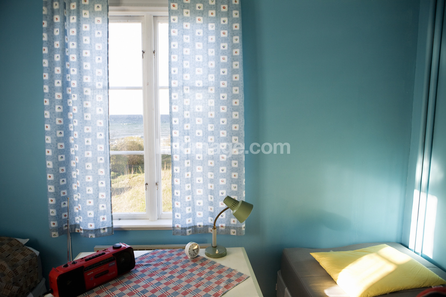 - window, summerhouse, views, radio, clock, lamp, blank, spring, sea, bed, cushion, colors, summer, holiday, leisure, relaxation