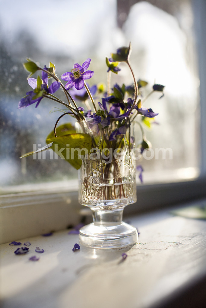 spring, flowers, hepatica, withered, present, window, glass, vase, windowsill, sun, light