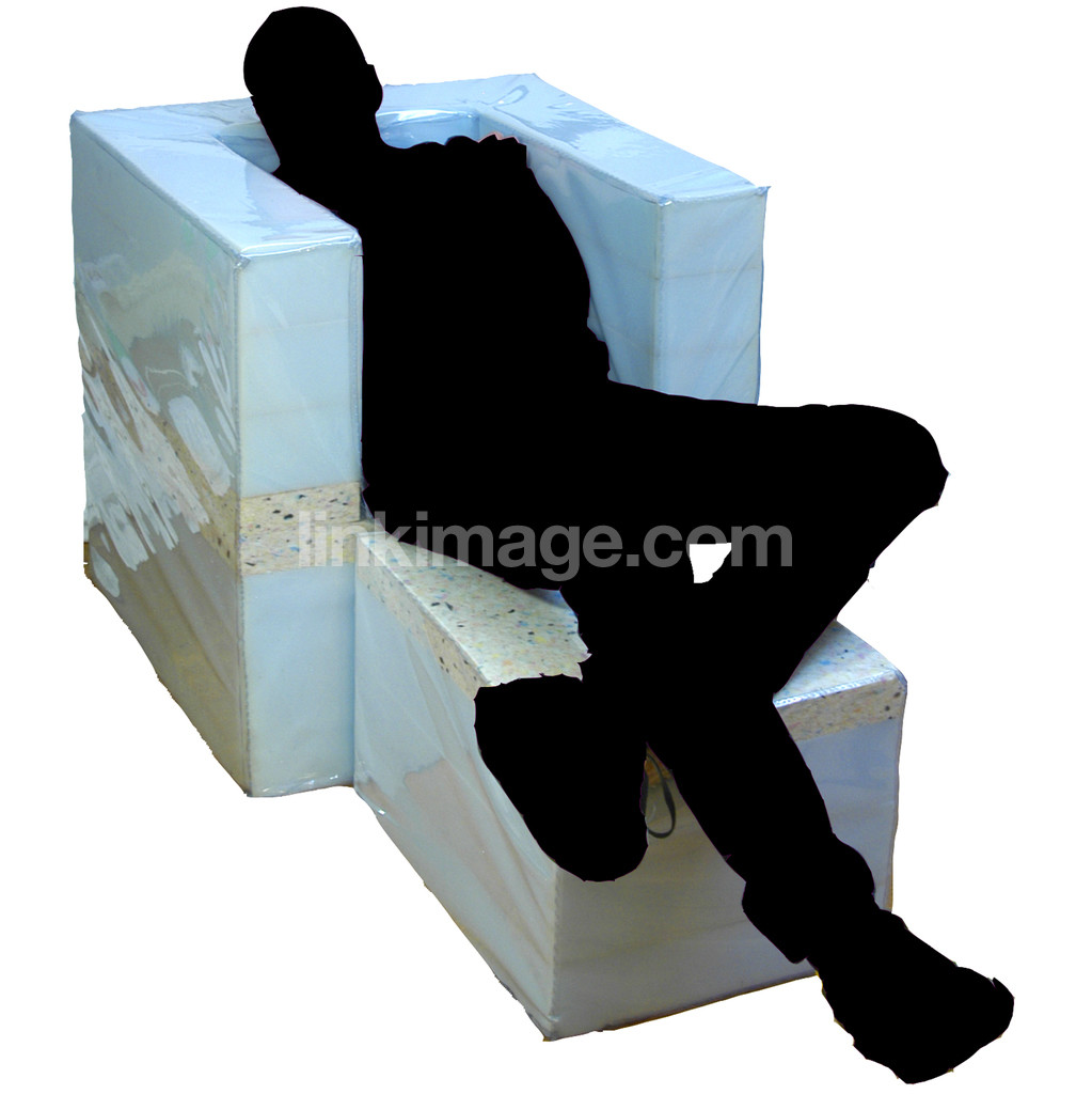 - human, male, black, carbon black, chair, armchair, plastic, plasticized, lie, sit, rest, relaxation, dressed in black, contrast, dark, light, blue