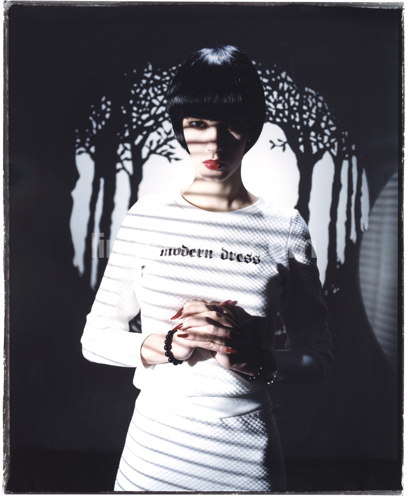 - human, female, model, fashion, studio, stage, lighting, dramatic, shadows, contrast, pose, clothes, attitude, clasped, hands