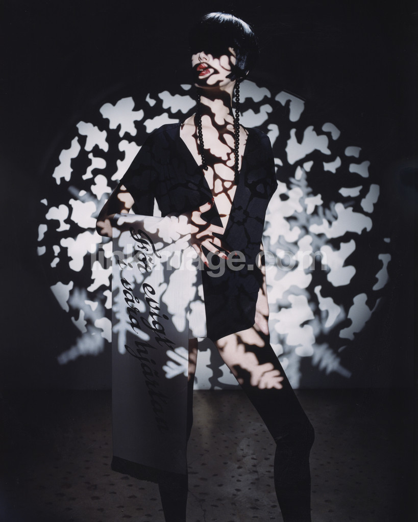 - human, female, model, fashion, studio, dark, black, contrast, lighting, dramatic, pose, pattern, shadows, attitude, cool, clothes