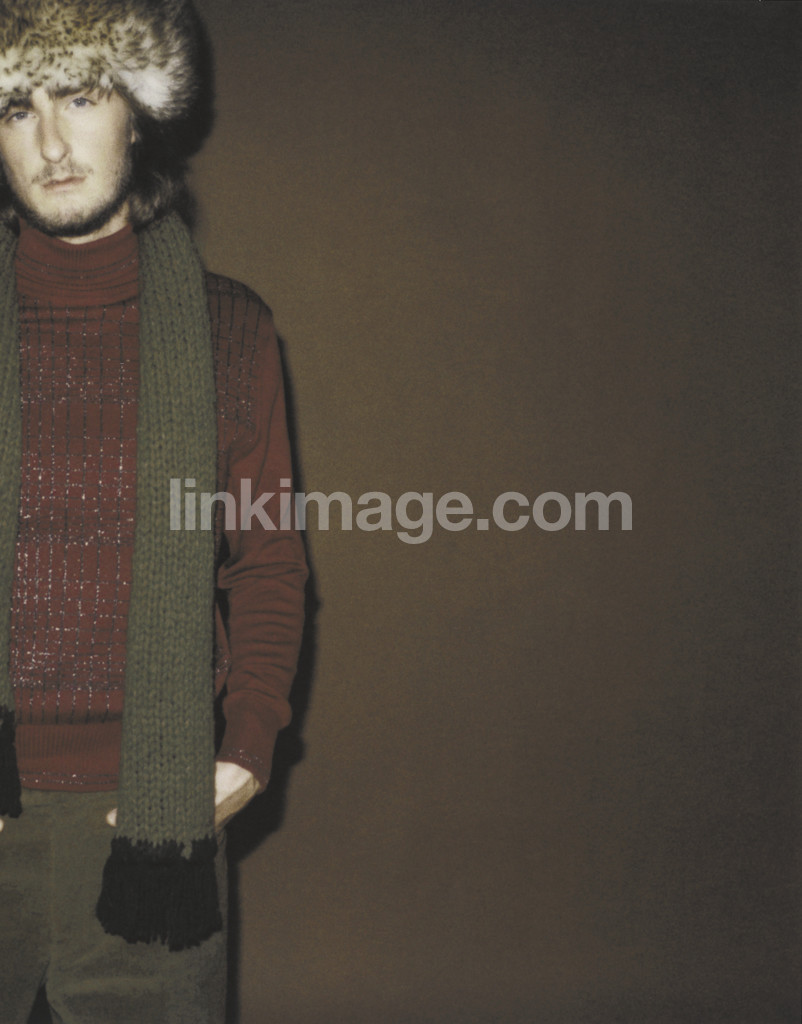 - human, male, model, fashion, portrait, fund, wall, brown, lighting, stand, pose, gaze, plug, fur hat, clothes