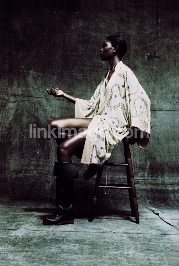 - human, female, model, fashion, light, dark, lighting, lit, stool, sit, pose, profile, dress, clothes, attitude