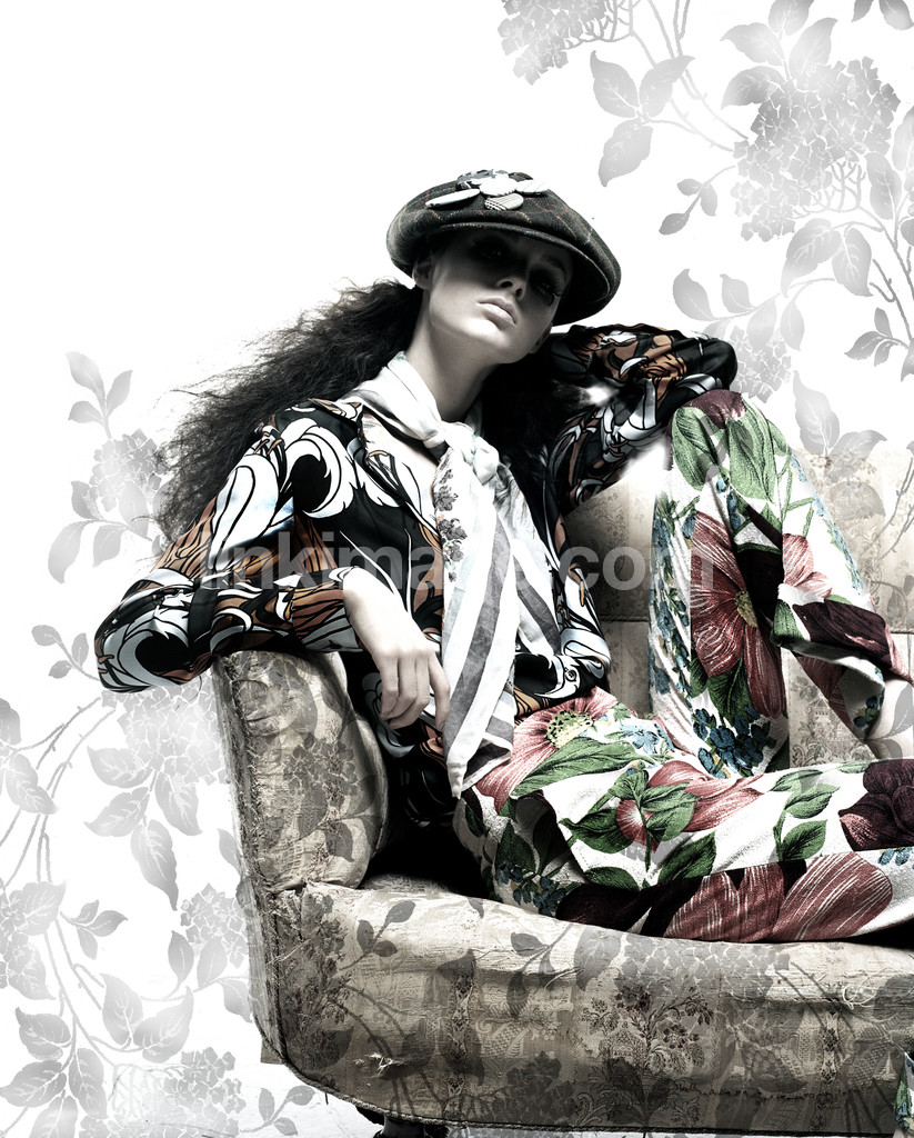 - human, female, model, fashion, studio, light, white, armchair, sofa, pattern, sit, pose, attitude, cocky, hat, headdress, clothes
