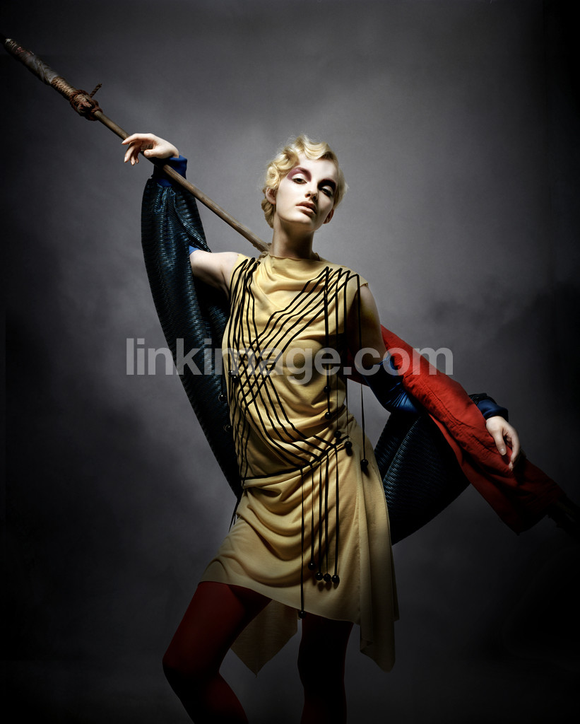 - human, female, model, fashion, studio, fund, light, dark, gray, lighting, pose, spear, rod, hold, attitude, dress, clothes
