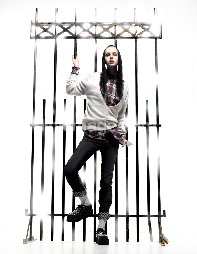 - human, female, model, fashion, studio, white, fence, tilt, to, lighting, pose, attitude, cocky, clothes