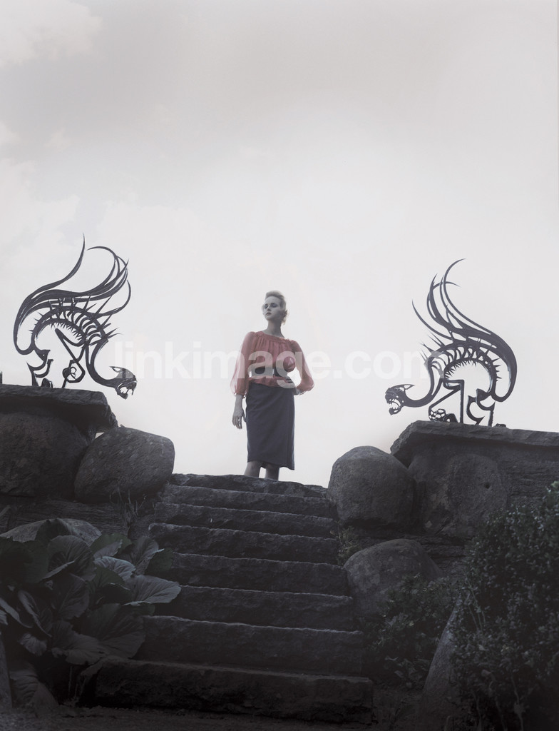 - human, female, model, fashion, outdoor, staircase, stone staircase, statues, kites, pose, clothes, sky, dark, muffled