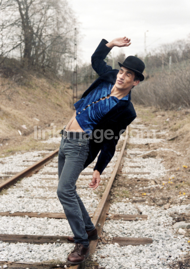 - male, rail, dance, happiness, enjoying, joy, hat, balance, track, railroad, fall, nature, forest, spot, happy