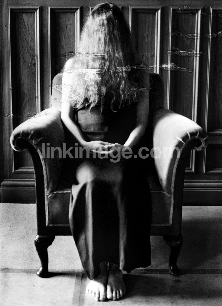 - female, armchair, hair, sit, hide, hidden, old, home, room, wall, mysterious, secretive, hold, on, upright