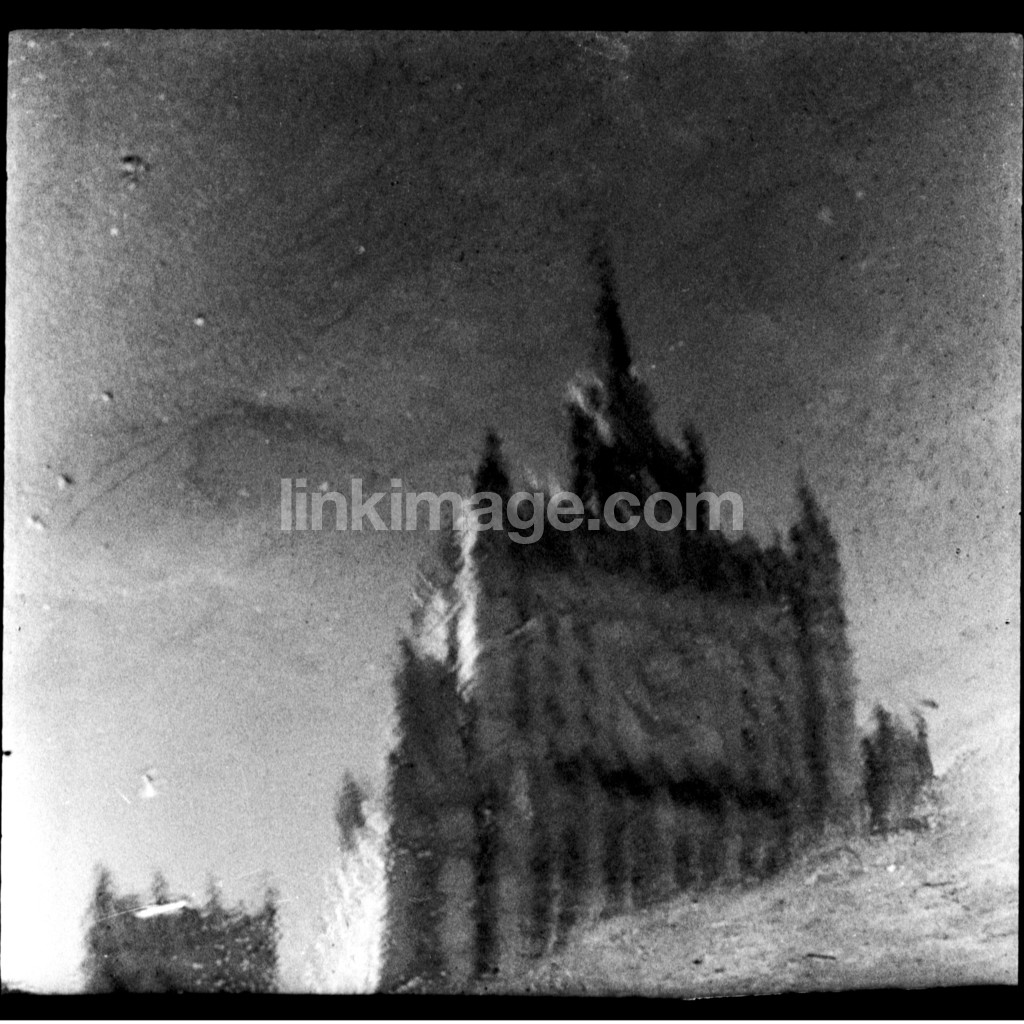 - building, mirror, puddle, house, unclear, fuzzy, large, grand, powerful, tower, dark