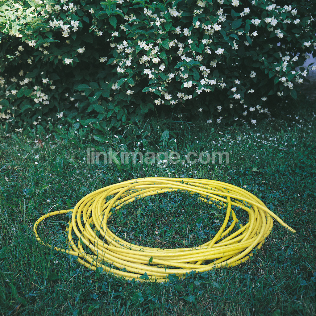 circle, round, hose, water hose, yellow, flowers, bush, jasmine, summer, garden, gear