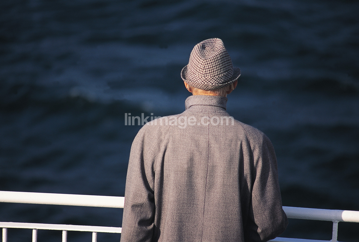 an, male, alone, lord, older, back, watch, desire, sea, water, ferry, waves, hat, gaze