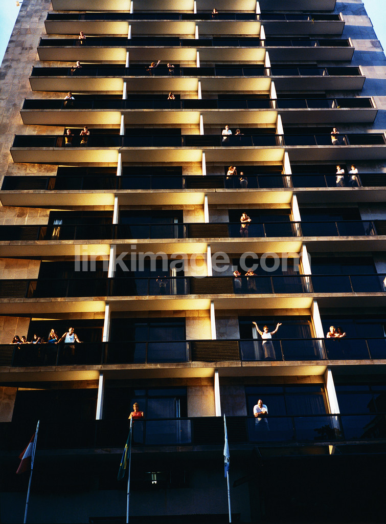 house, building, rise, balcony, balconies, people, waving, happy, evening, dusk, sunset, city, sl185