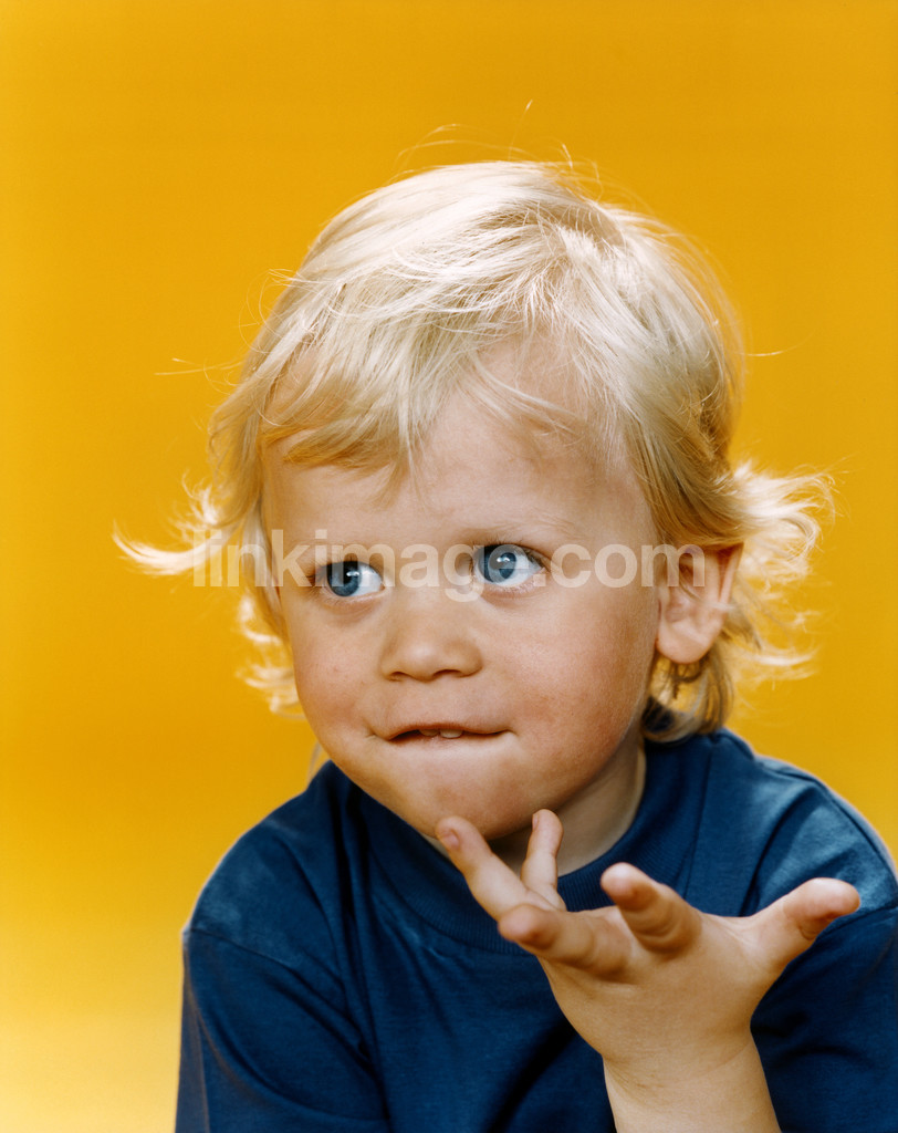 - children, boy, thoughtful, happy, playful, studio, light, orange, blue, blonde, hair, curious, eyes, hand, sl206