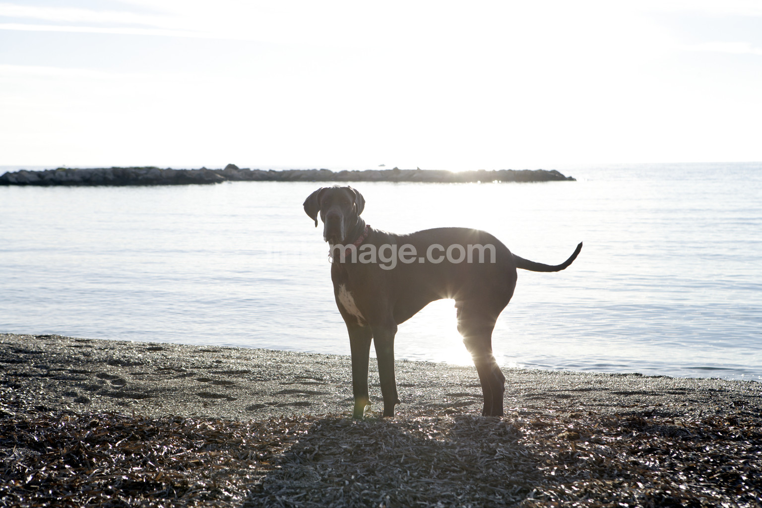 nature, water, sea, shore, sandy beach, animals, pet, dog, freedom, sun, summer, heat, curious, happy, sl761